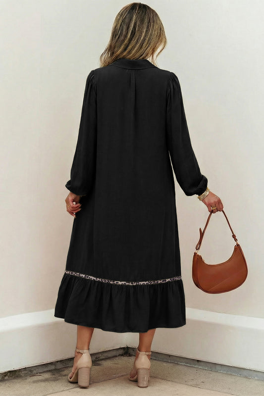 Black Collared V Neck Smocked Detail Contrast Leopard Trim Bracelet Sleeve Long Dress